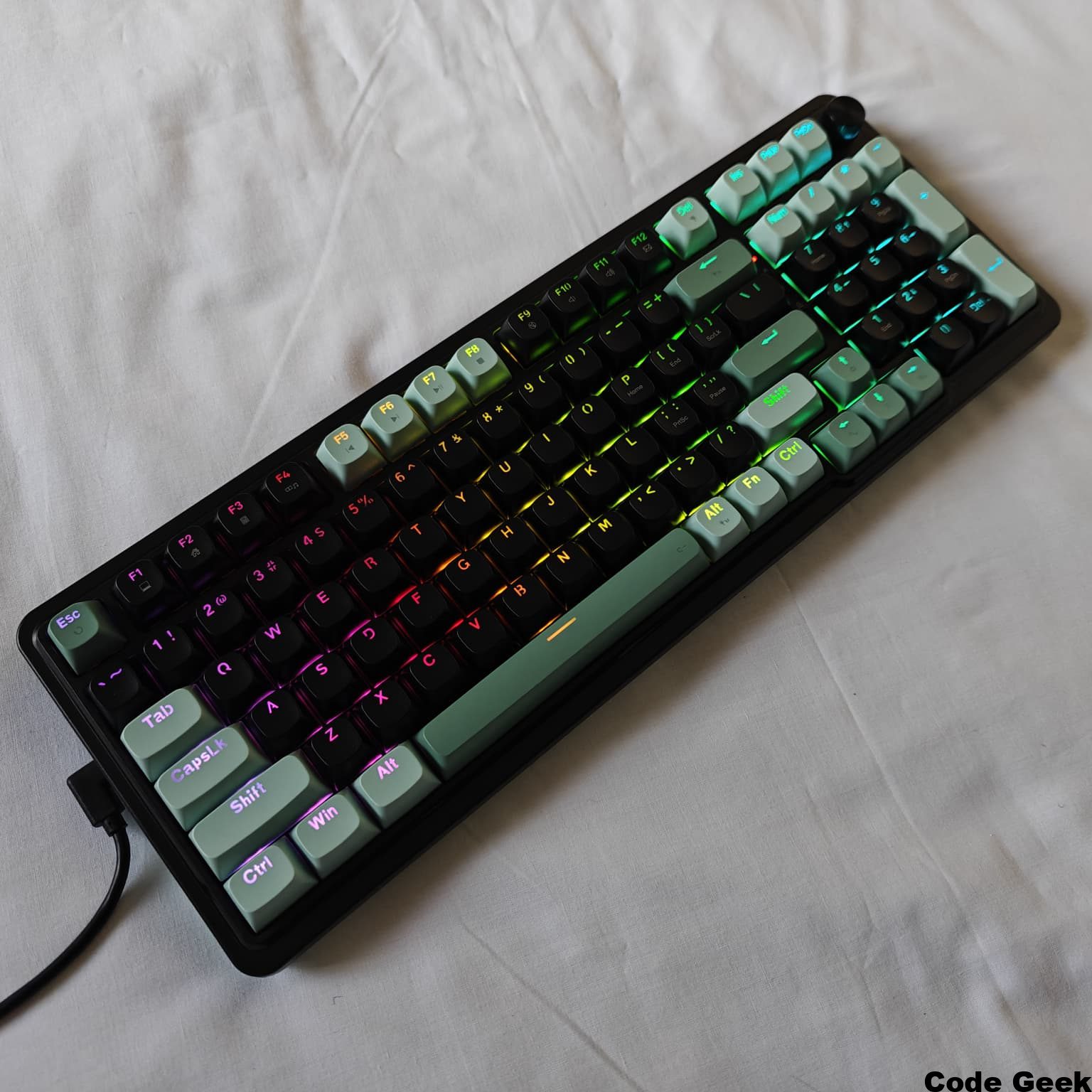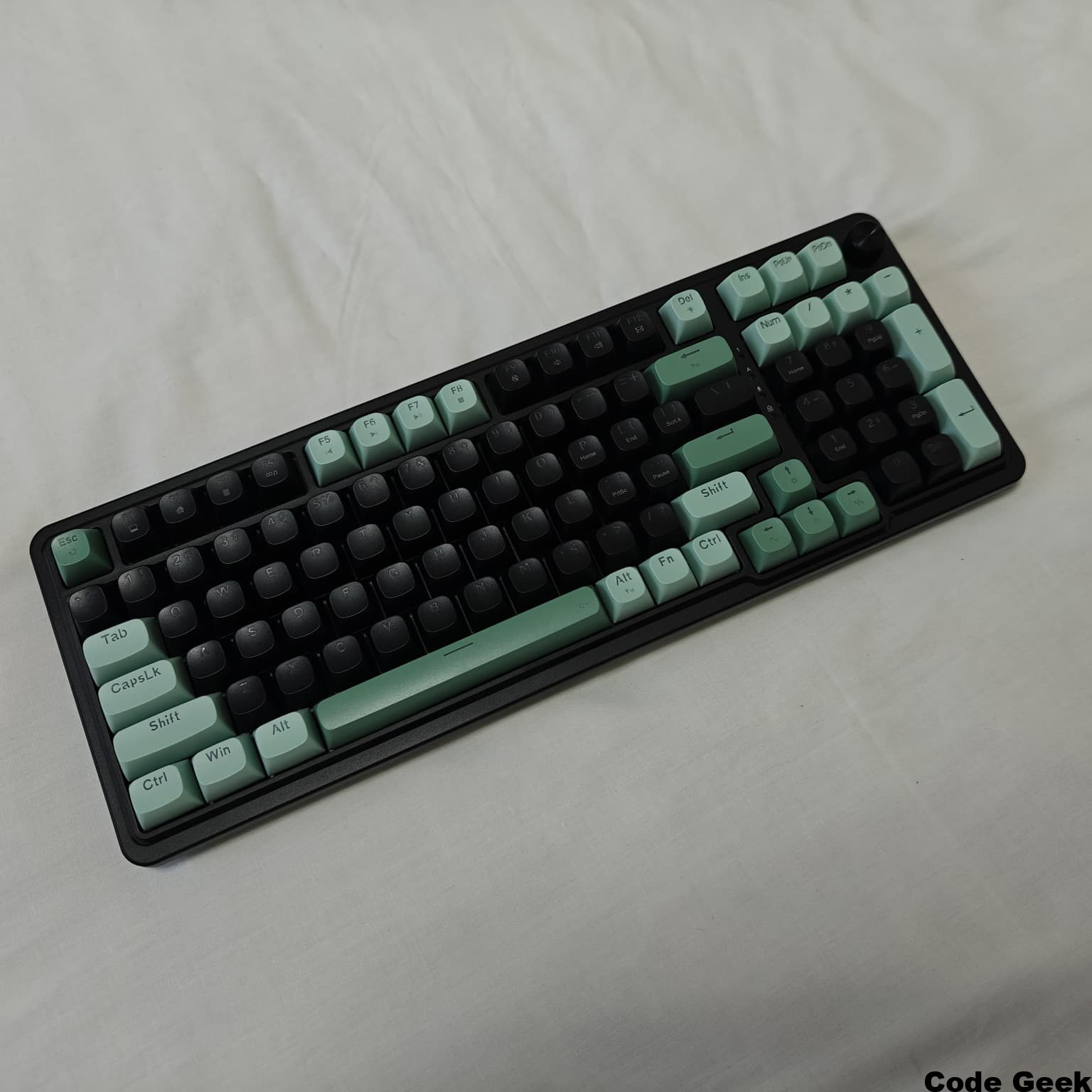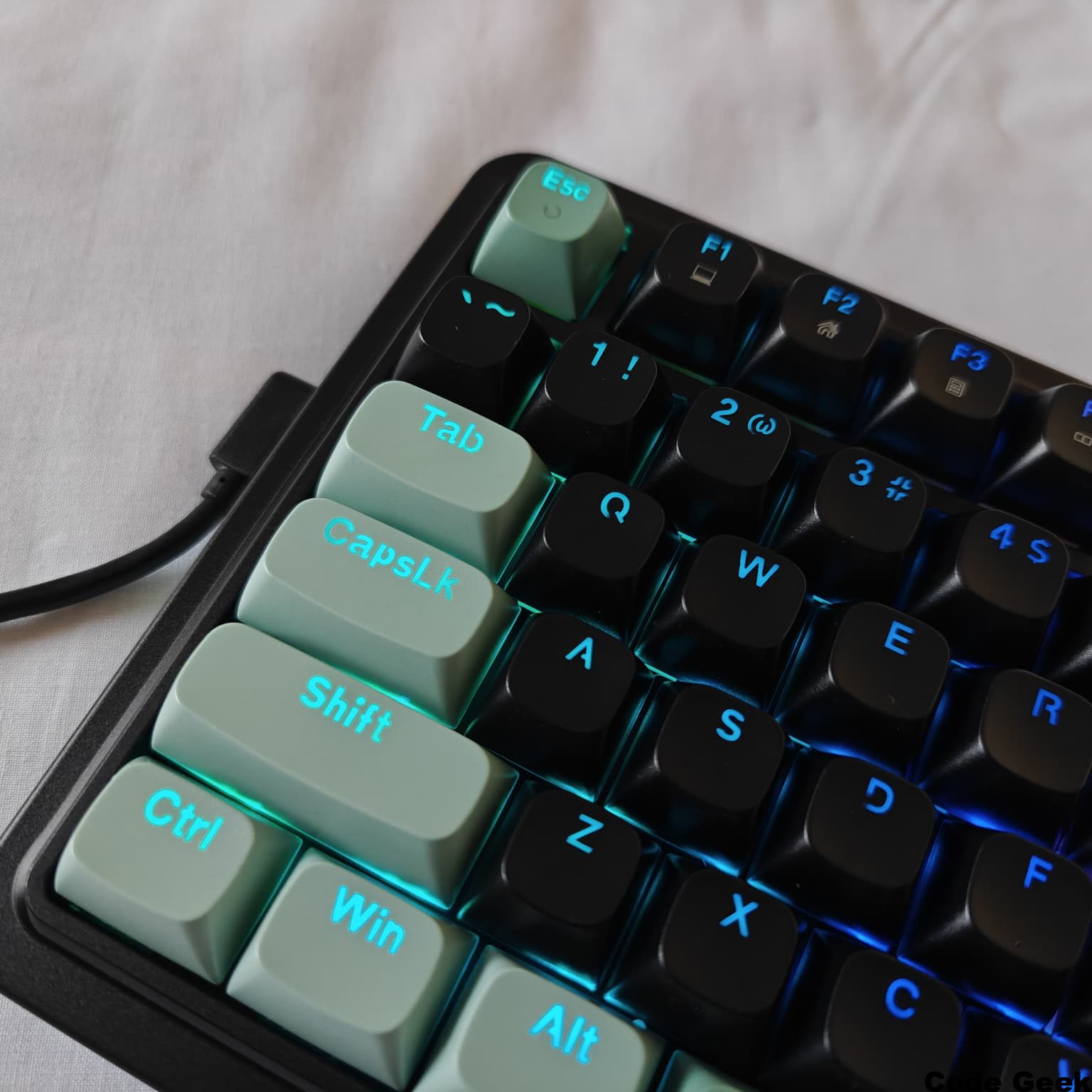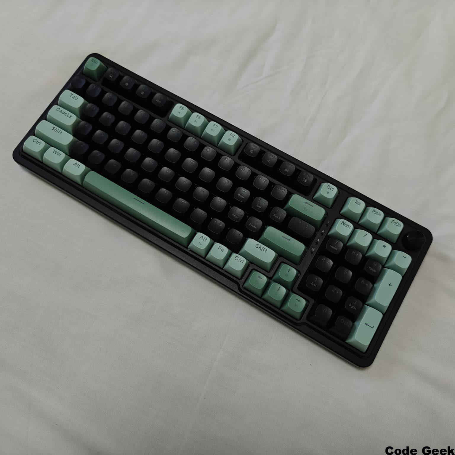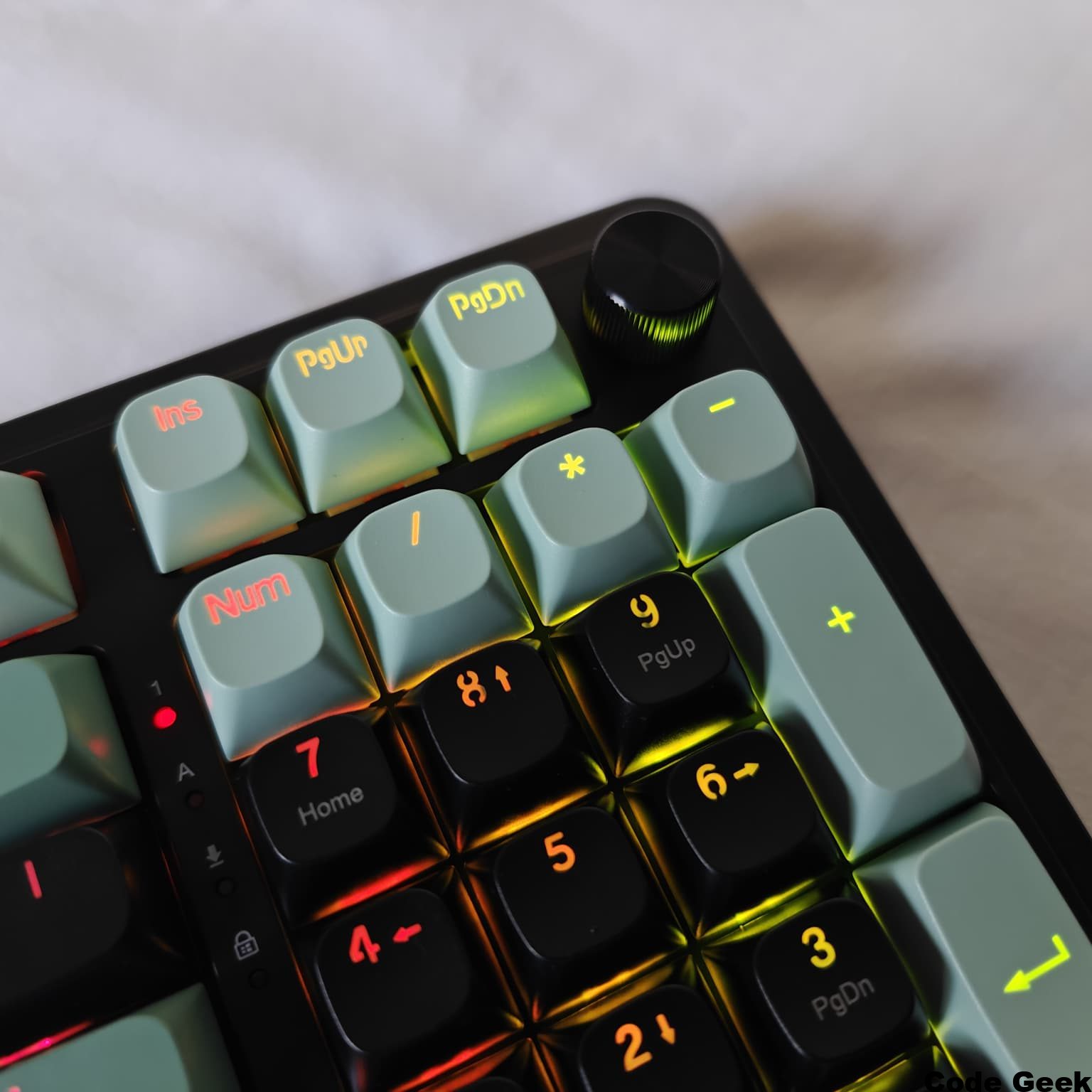 Uno de los pilares de su diseño es la estructura anti-wobble de doble módulo. A diferencia de los diseños tradicionales que utilizan tornillos, este teclado emplea cubiertas de precisión ajustadas con juntas que, combinadas con dos capas de amortiguación de ruido, consiguen reducir significativamente el sonido hueco y las vibraciones metálicas. El resultado es una sensación de escritura más nítida y limpia, lo que se traduce en una experiencia acústica más satisfactoria. Las keycaps están fabricadas en PBT, un material reconocido por su mayor durabilidad y resistencia al brillo por uso compared to the more common ABS plastic.