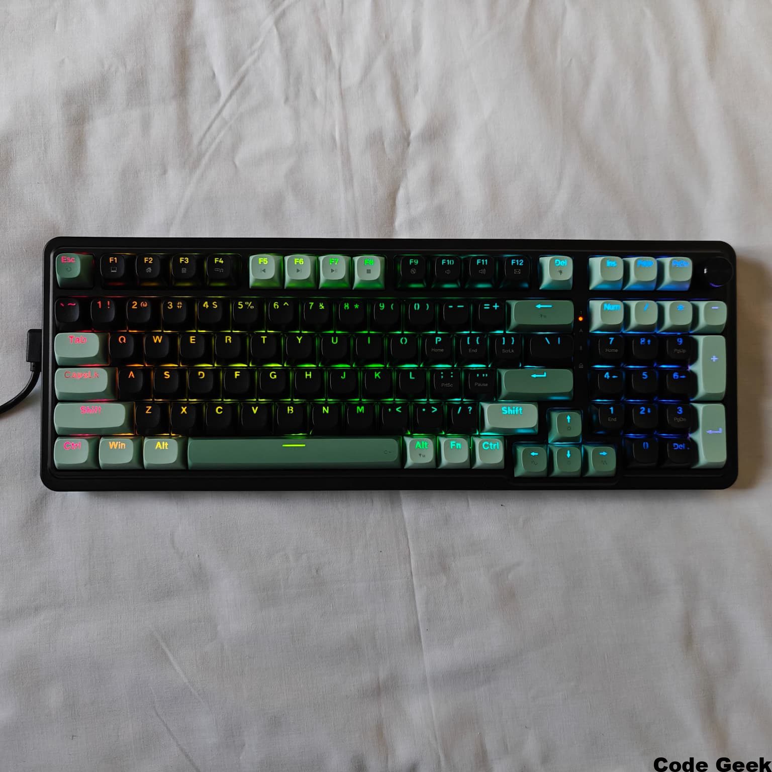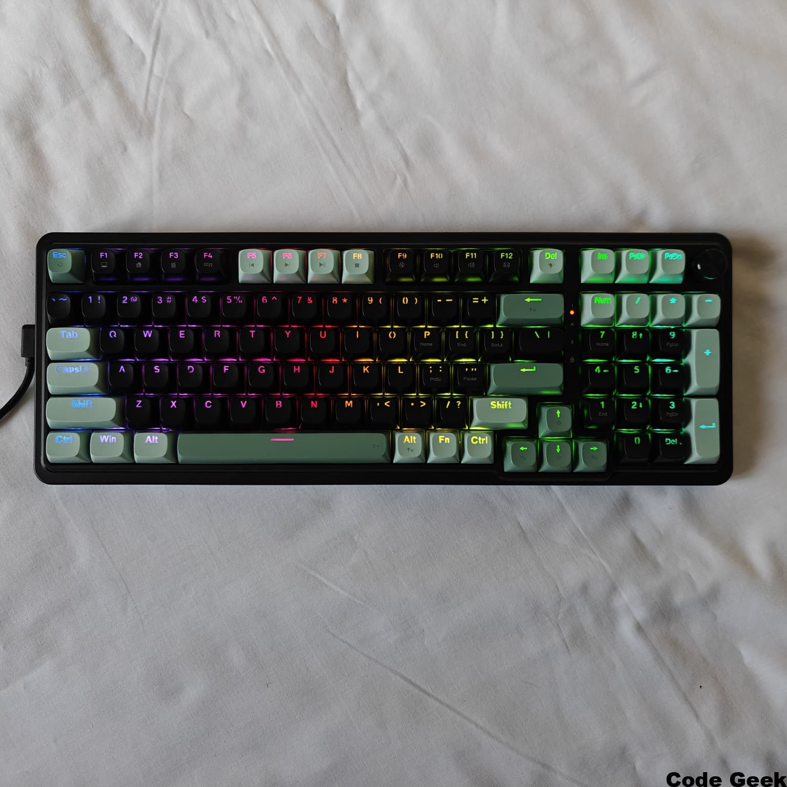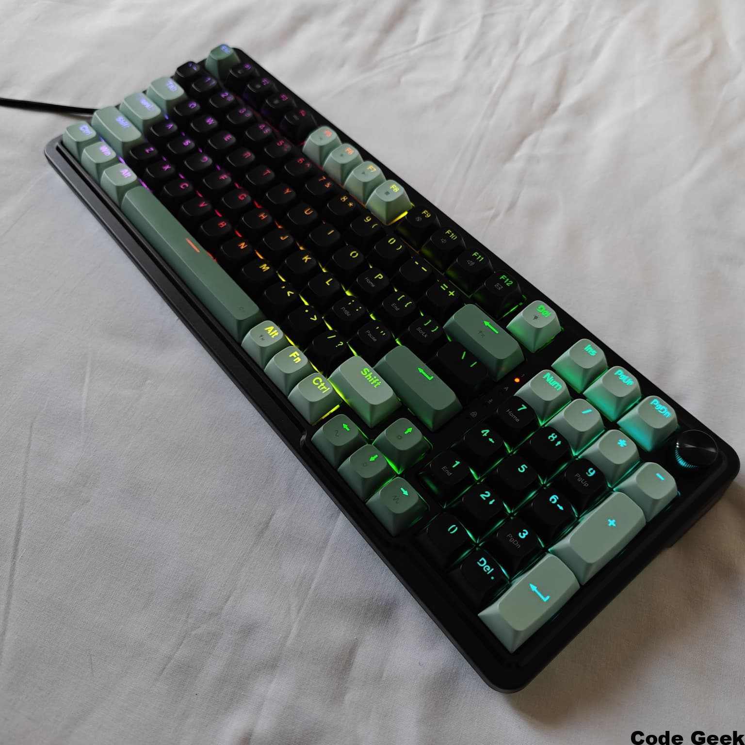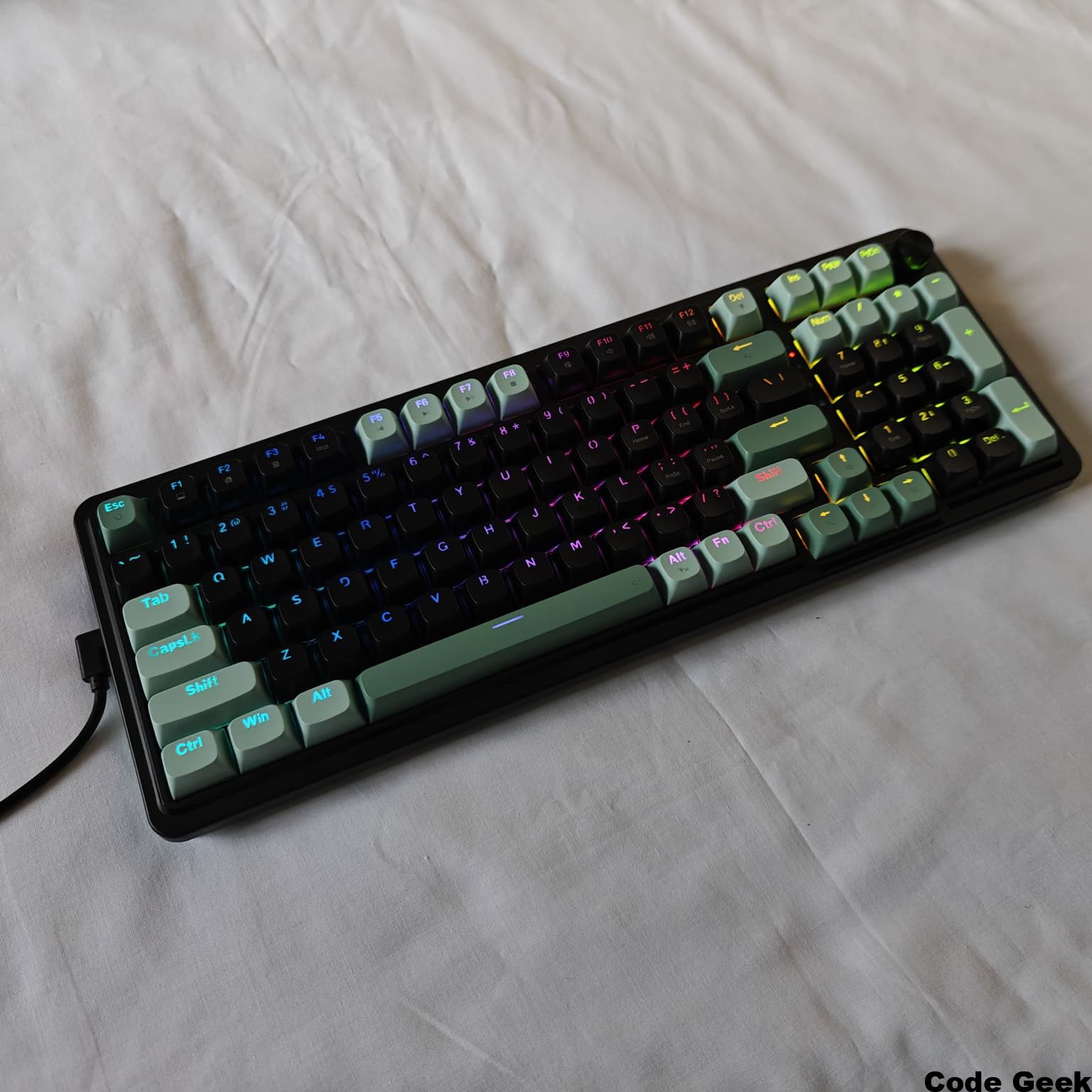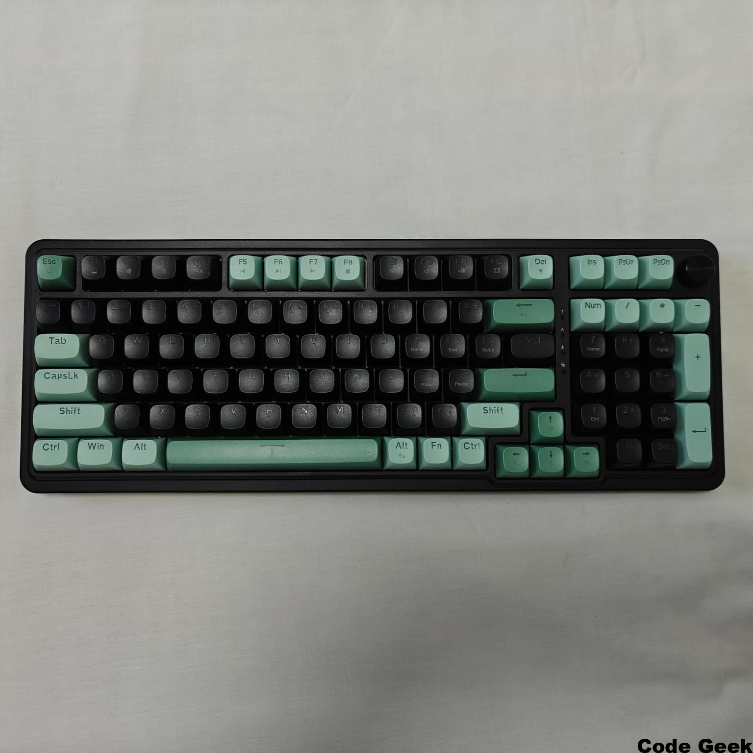 Uno de los pilares de su diseño es la estructura anti-wobble de doble módulo. A diferencia de los diseños tradicionales que utilizan tornillos, este teclado emplea cubiertas de precisión ajustadas con juntas que, combinadas con dos capas de amortiguación de ruido, consiguen reducir significativamente el sonido hueco y las vibraciones metálicas. El resultado es una sensación de escritura más nítida y limpia, lo que se traduce en una experiencia acústica más satisfactoria. Las keycaps están fabricadas en PBT, un material reconocido por su mayor durabilidad y resistencia al brillo por uso compared to the more common ABS plastic.
