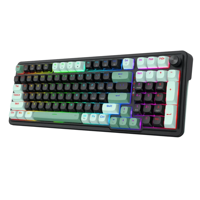 El Redragon EISA K686 HE presenta un diseño compacto del 96% que integra 98 teclas. Esta distribución mantiene todas las funciones de un teclado de tamaño completo, incluyendo el bloque numérico, pero en un formato que reduce su huella en el escritorio aproximadamente en un 20%. Esto resulta ideal para quienes disponen de espacio limitado o prefieren tener más área para movimientos amplios del mouse. La estética general es robusta, con un peso de 1.2 kg que sugiere una construcción sólida.