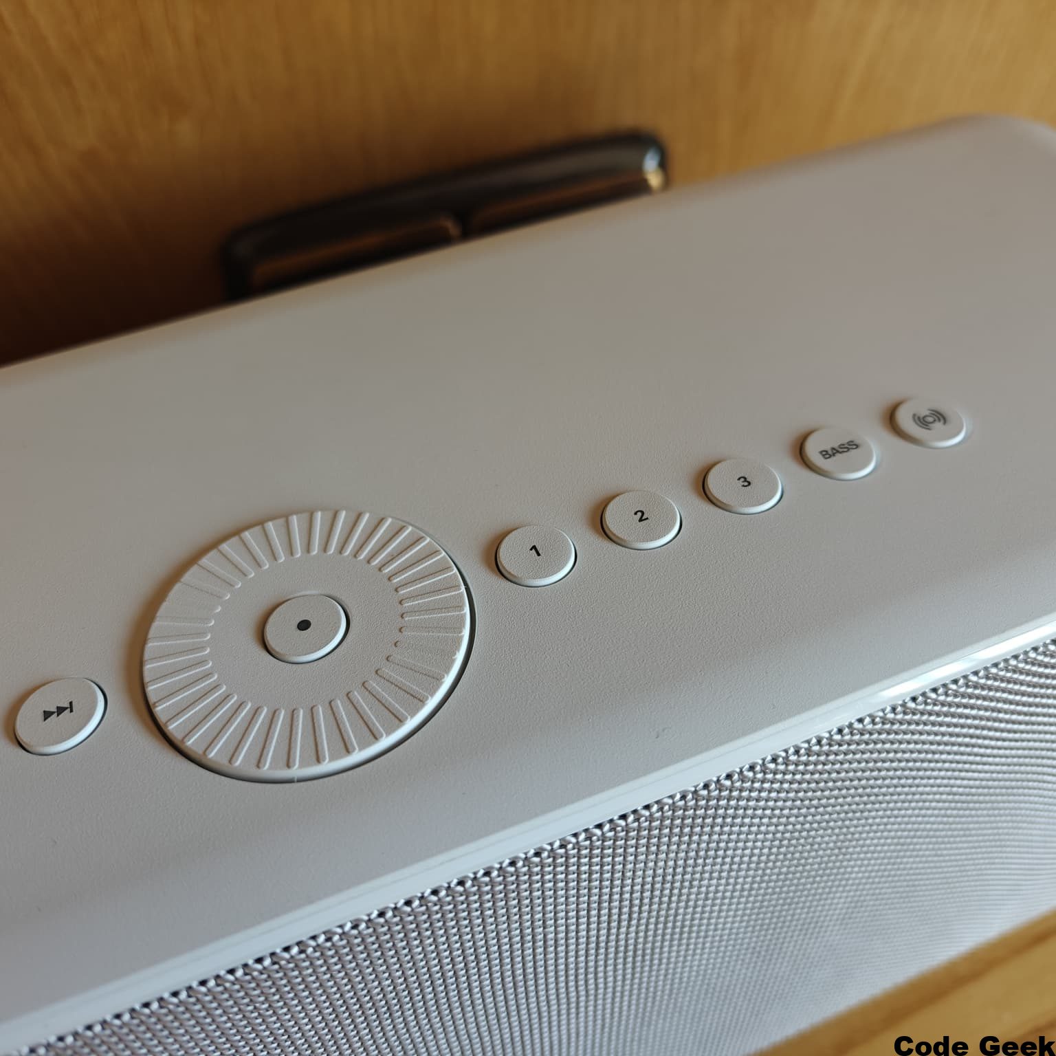 En la parte superior del equipo encontramos un panel de control intuitivo y bien distribuido que incluye botones iluminados para las funciones principales: encendido, selección de fuente, conexión Bluetooth, controles de reproducción y tres prácticos botones de favoritos personalizables. Uno de los elementos más valorados es la rueda de volumen física de precisión, que permite ajustes suaves y control total sobre el nivel de sonido. La asa integrada en la parte posterior facilita enormemente el transporte entre distintas estancias, haciendo honor a su naturaleza portátil.
