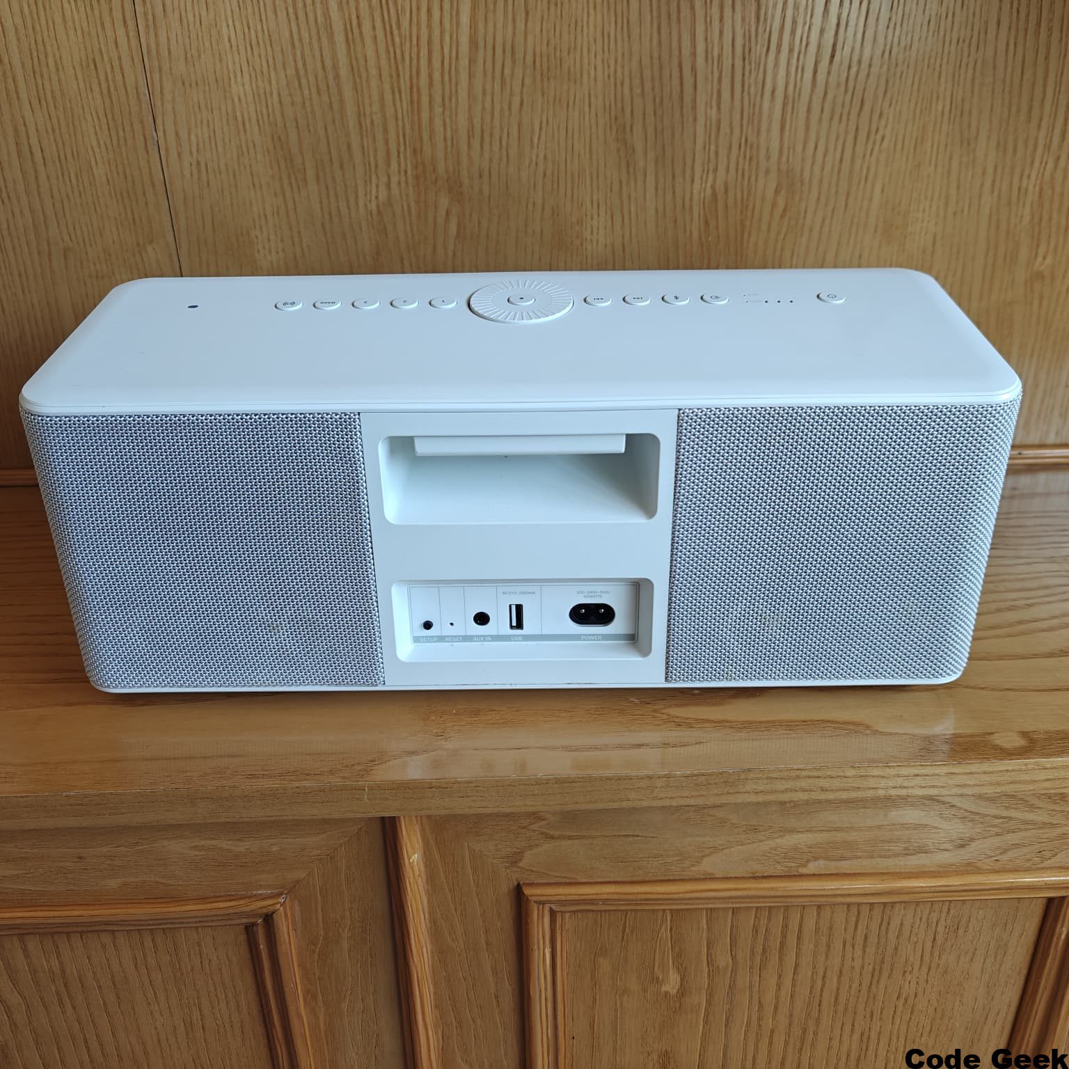 En la parte posterior se localizan las conexiones completas: una entrada auxiliar de 3.5 mm para conectar fuentes de audio externas, un puerto USB que funciona como power bank para cargar otros dispositivos con una potencia de hasta 7.5 W, y el conector para la alimentación principal. El diseño general refleja un equilibrio perfecto entre estética y funcionalidad.