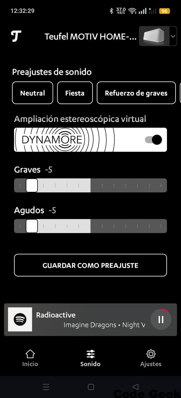 Uno de los elementos tecnológicos más distintivos del MOTIV HOME es el sistema Dynamore Ultra, desarrollado por Teufel para crear un panorama estéreo virtual envolvente a partir de una única caja. Esta tecnología, que puede activarse mediante un botón dedicado o a través de la aplicación, procesa digitalmente la señal para expandir la escena sonora y crear una experiencia más inmersiva y room-filling.