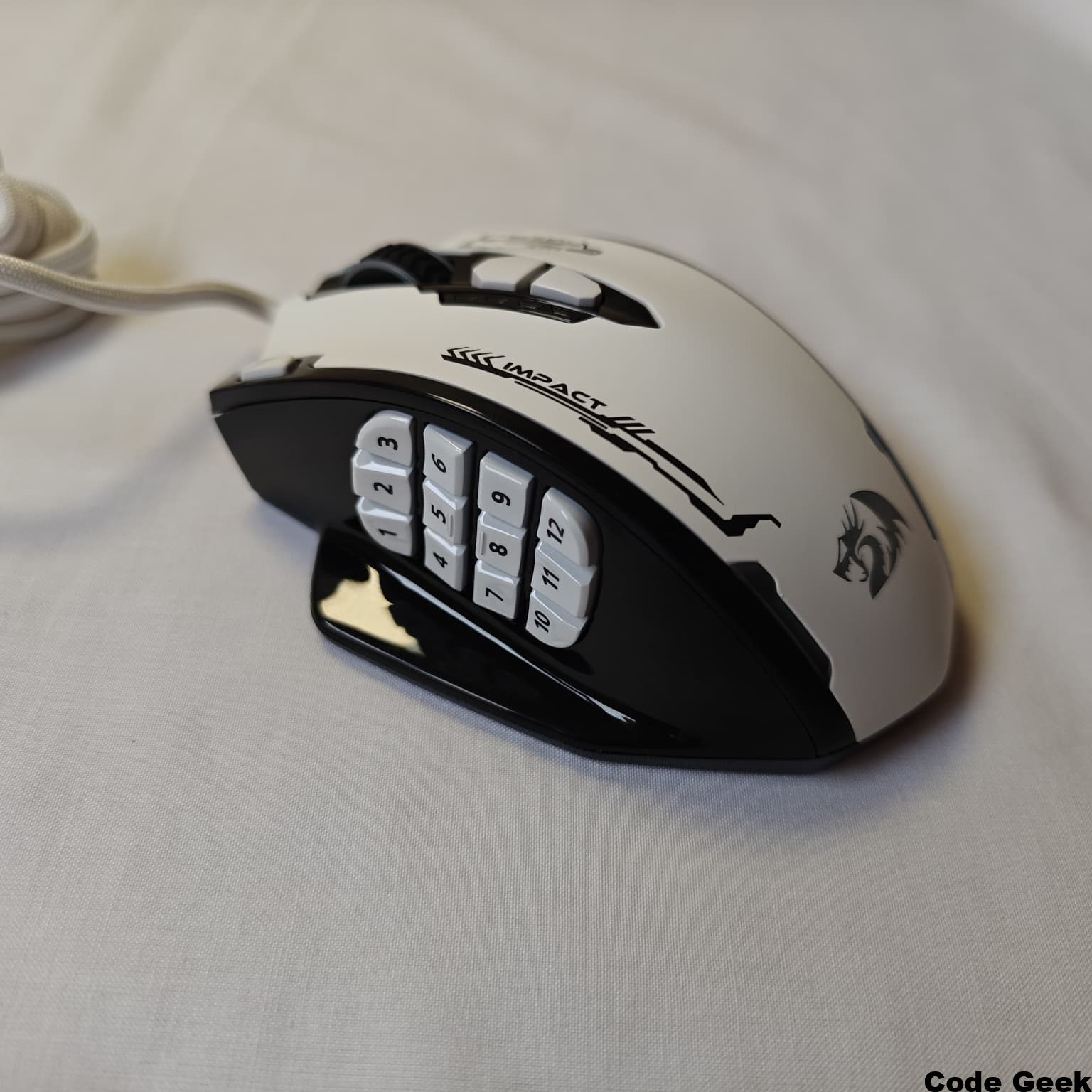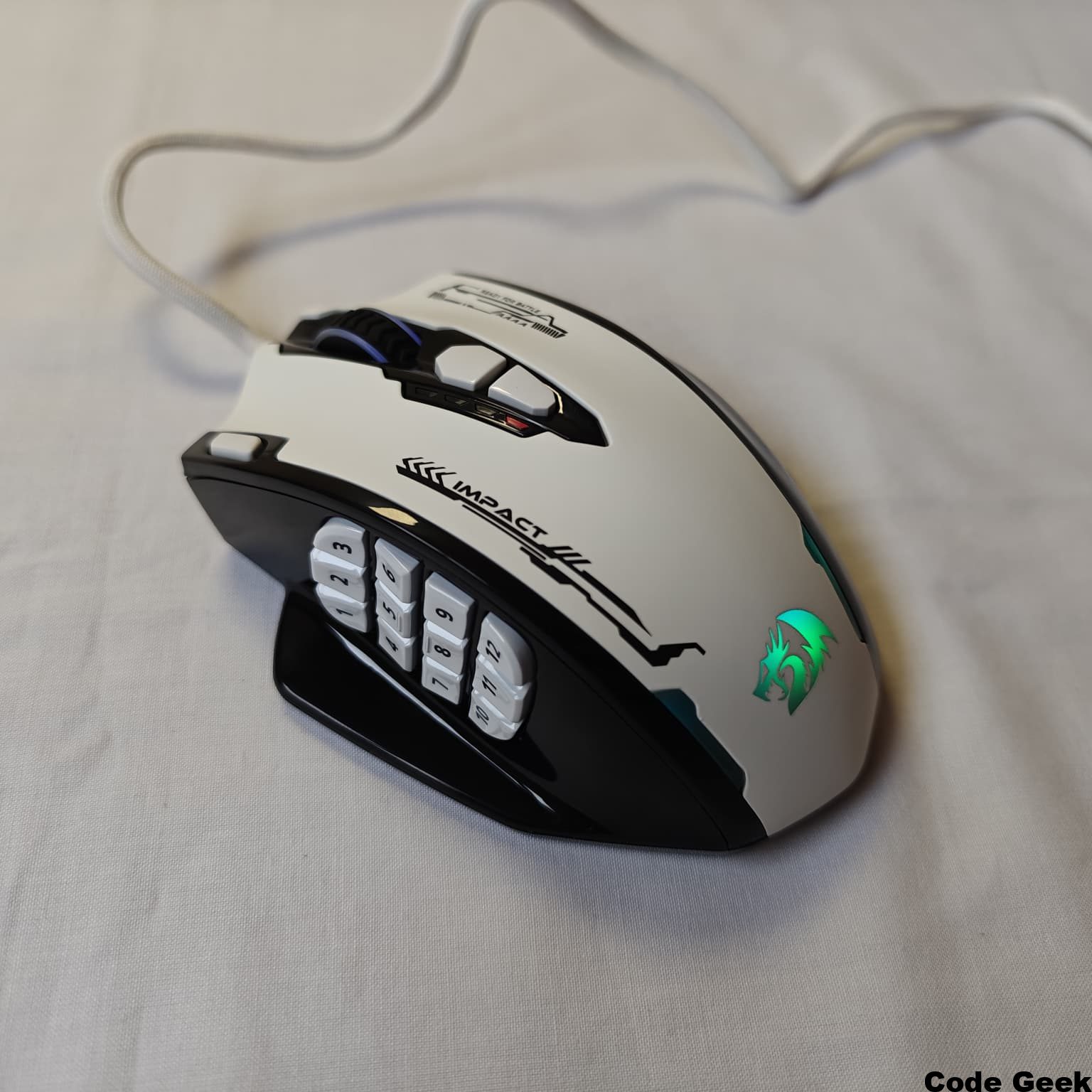 Una de las características más destacables de su diseño es el apoyo integrado para el dedo meñique y anular en el lateral derecho. Este elemento, a menudo pasado por alto en otros ratones, proporciona una sensación de estabilidad y comodidad excepcional, permitiendo que la mano descanse de forma natural y relajada sobre el periférico . En el lateral izquierdo, un reposapulgares amplio y ligeramente inclinado alberga la famosa matriz de 12 botones MMO. Este diseño no solo ofrece comodidad, sino que también dota al ratón de una estética simétrica y equilibrada que lo distingue visualmente de la competencia . El cable mallado de 1.8 metros de longitud no solo es extremadamente resistente, sino que también minimiza los enredos, facilitando la gestión del espacio en el escritorio .