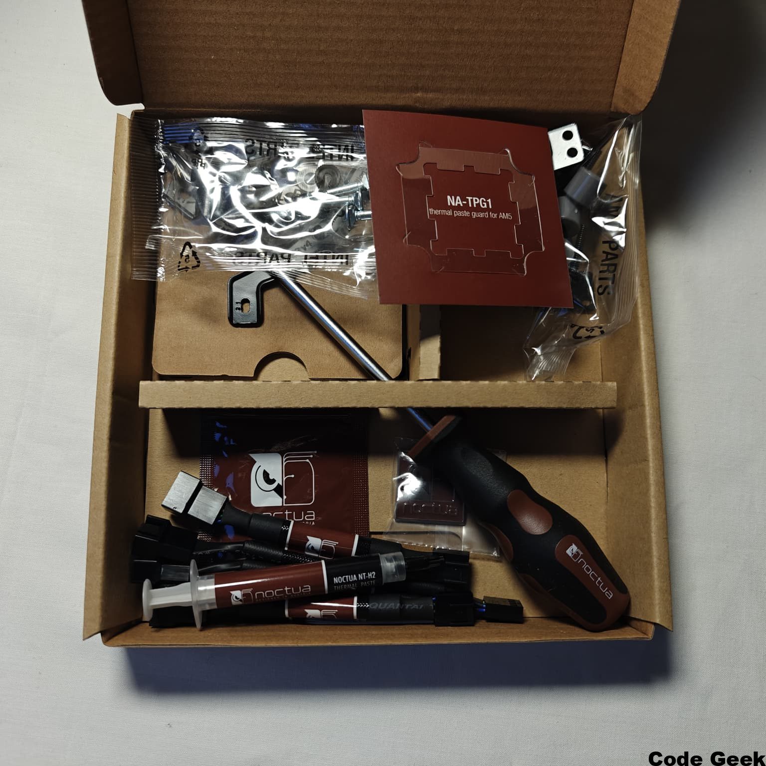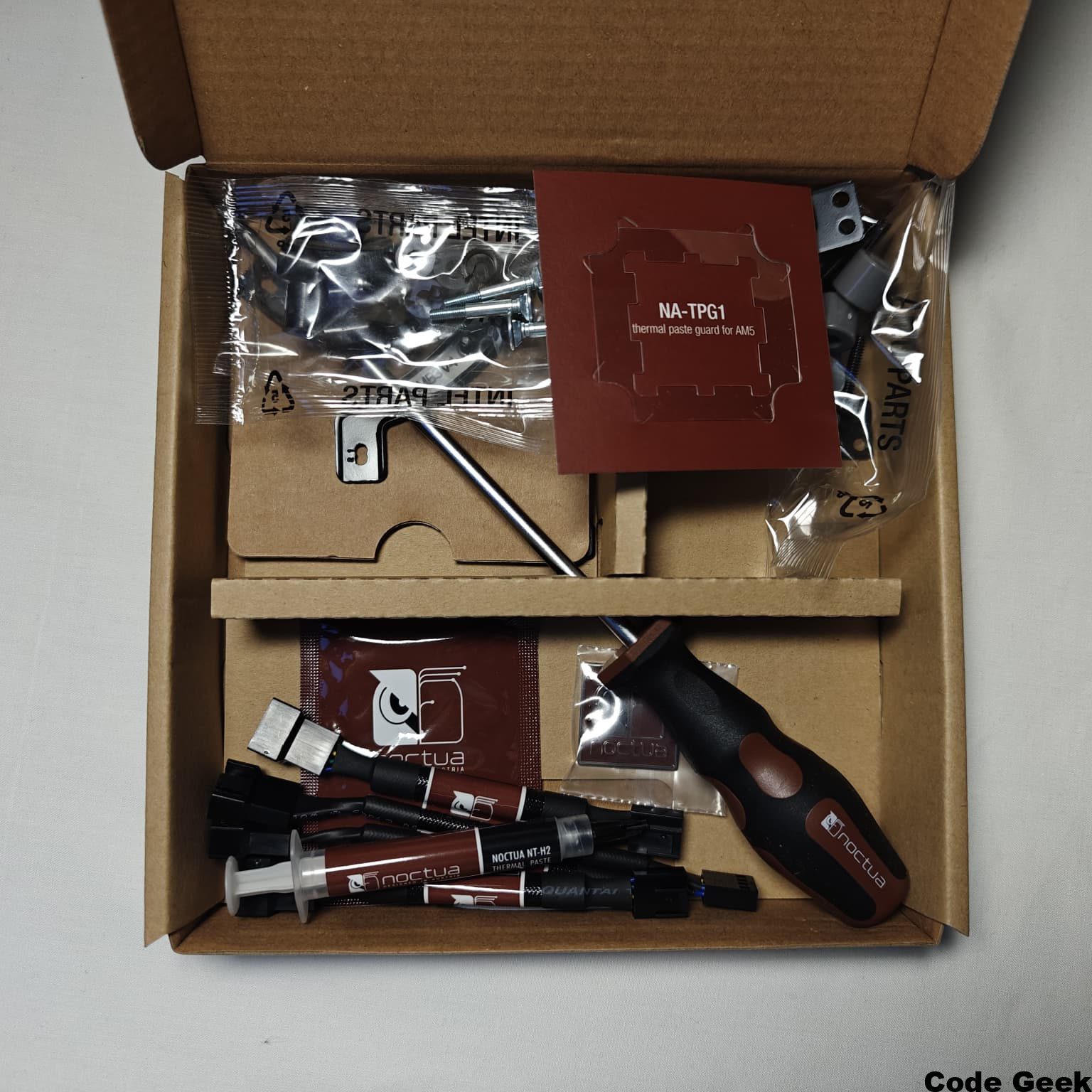 El paquete incluye la prestigiosa pasta térmica NT-H2, un referente en conductividad, y un detalle innovador para usuarios de AMD AM5: el protector NA-TPG1, diseñado para evitar derrames de pasta alrededor del encapsulado del IHS. Incluso se incluye una toallita de limpieza NA-CW1, algo poco común pero muy útil. Para la gestión y el control, se proporciona un cable splitter PWM NA-YC1 (con cables mallados en negro para mantener la estética) y dos adaptadores de bajo ruido NA-RC16 (L.N.A.), que permiten limitar automáticamente la velocidad máxima de los ventiladores para priorizar el silencio. La guinda es un destornillador Torx® NM-SD1 de calidad y una insignia metálica para el chasis. Es, sin duda, uno de los sets de accesorios más completos del mercado.