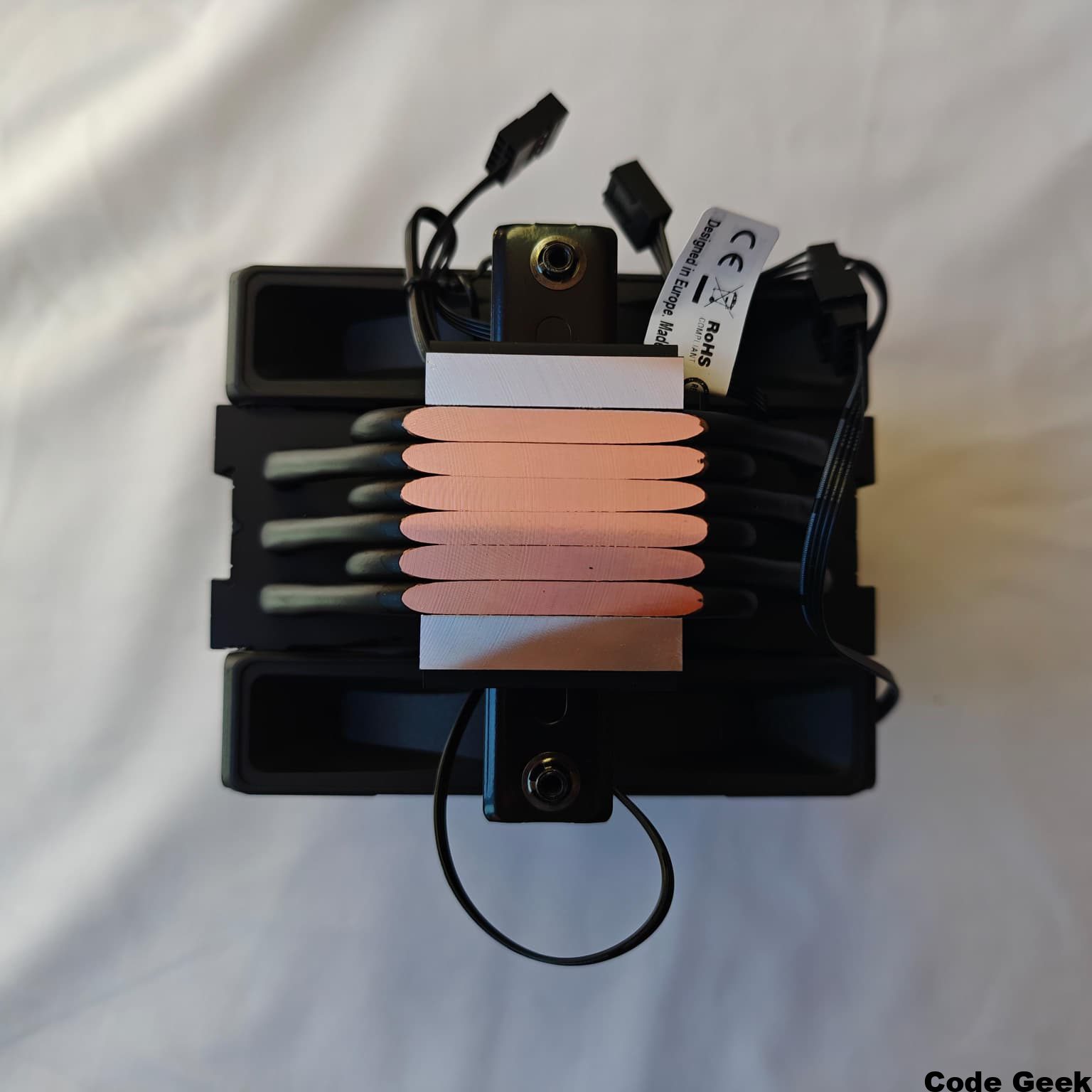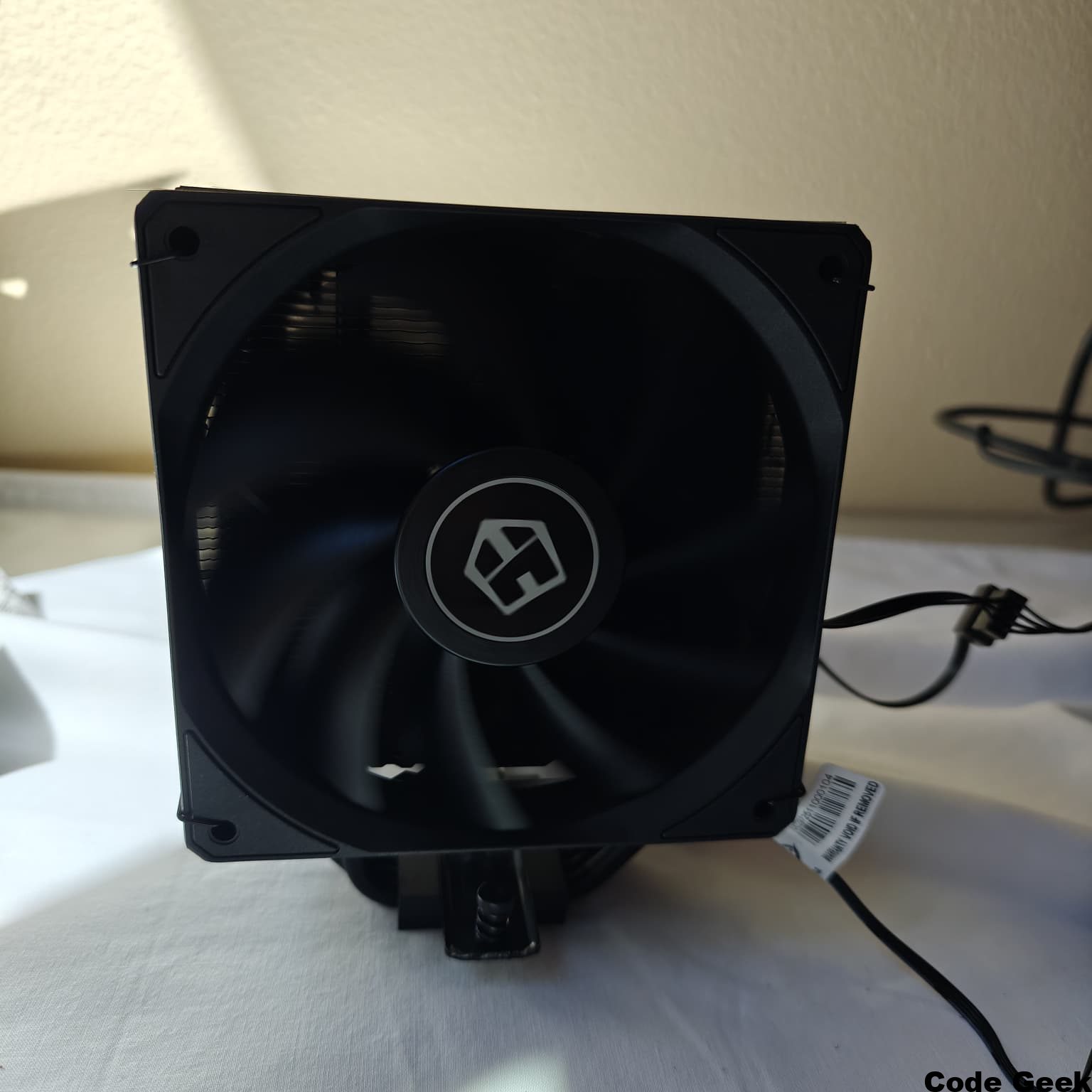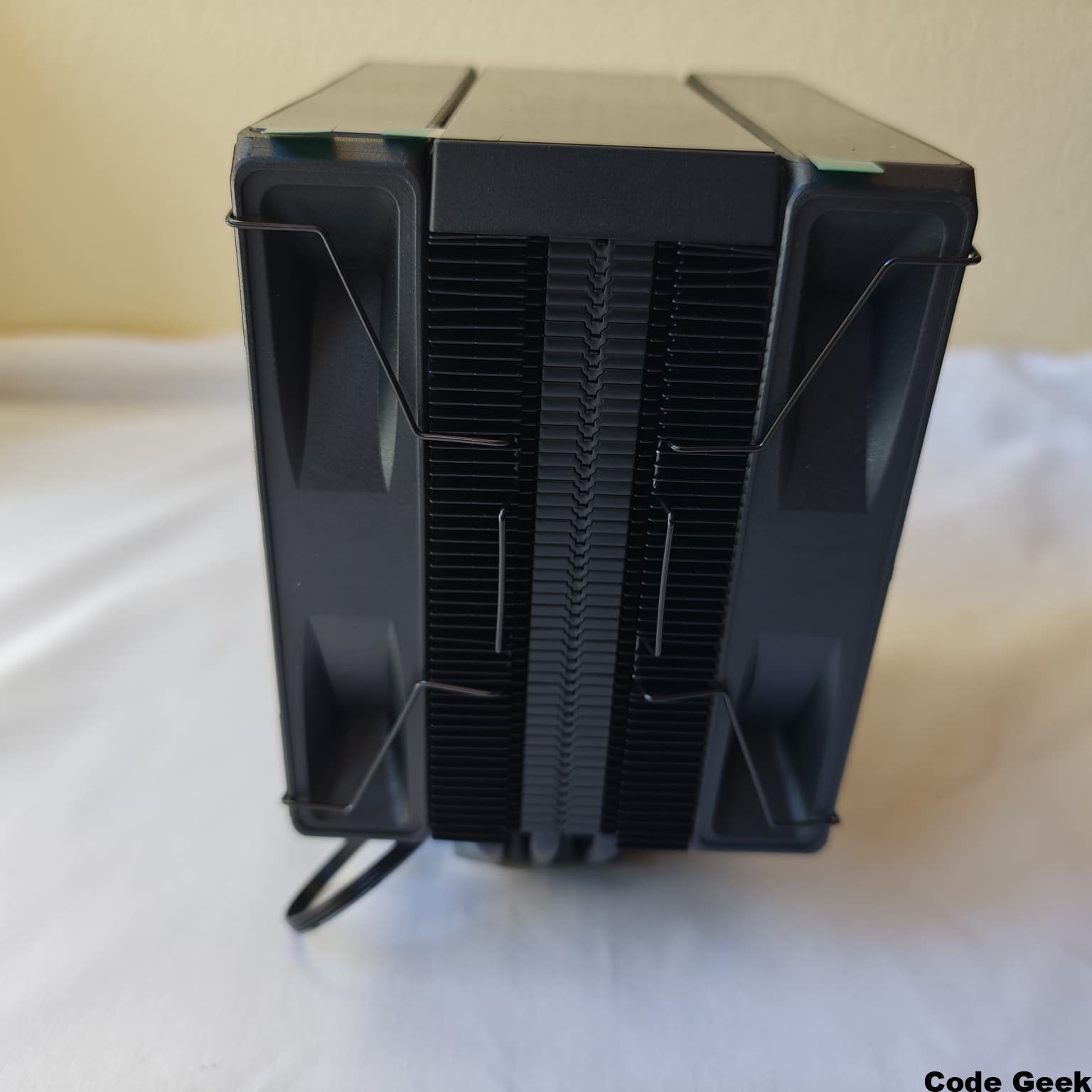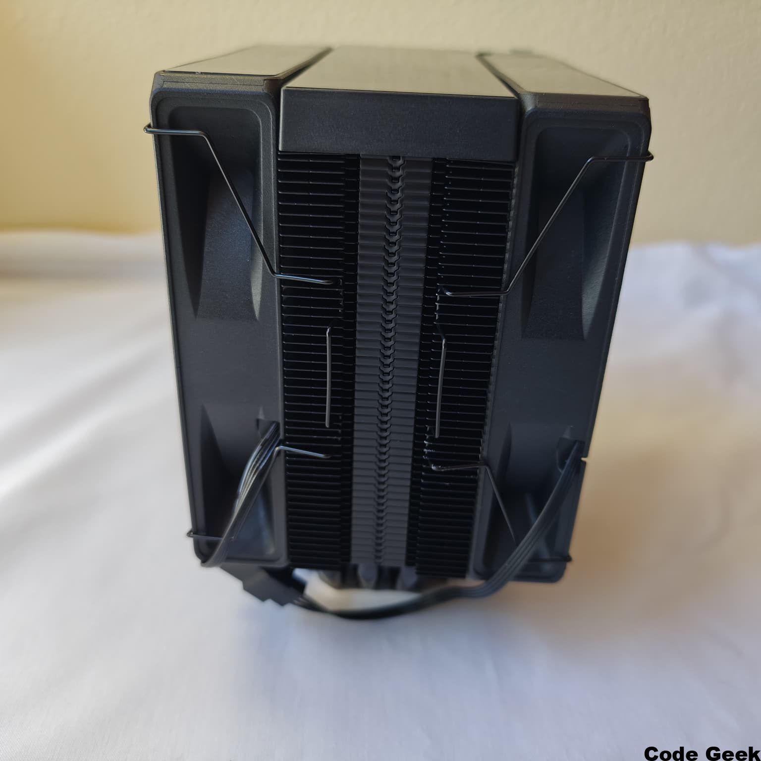 Para garantizar que todo este calor acumulado sea expulsado rápidamente fuera del chasis, la marca ha apostado sobre seguro incorporando una configuración de doble ventilador en un agresivo formato «push-pull». Al igual que vimos en su versión ARGB, este modelo confía en unos imponentes ventiladores de tamaño superior al estándar para maximizar el flujo aerodinámico. Esta inteligente decisión de diseño permite empujar un inmenso volumen de aire a través de la densa selva de aletas de aluminio sin la imperiosa necesidad de que los motores giren a revoluciones extremas y escandalosas. El resultado directo de esta combinación termodinámica es un rendimiento gélido capaz de mantener a raya el estrangulamiento térmico o «thermal throttling», operando bajo un silencio sepulcral gracias a sus rodamientos hidráulicos de baja fricción y a sus eficientes pads antivibración de goma situados en las esquinas de los marcos. La gestión automática de las velocidades mediante PWM (Pulse Width Modulation) asegura que el disipador sea inaudible mientras navegas por internet o ves películas, acelerando su maquinaria térmica de forma dinámica y progresiva únicamente cuando inicias un videojuego pesado o una exigente sesión de renderizado en 3D.